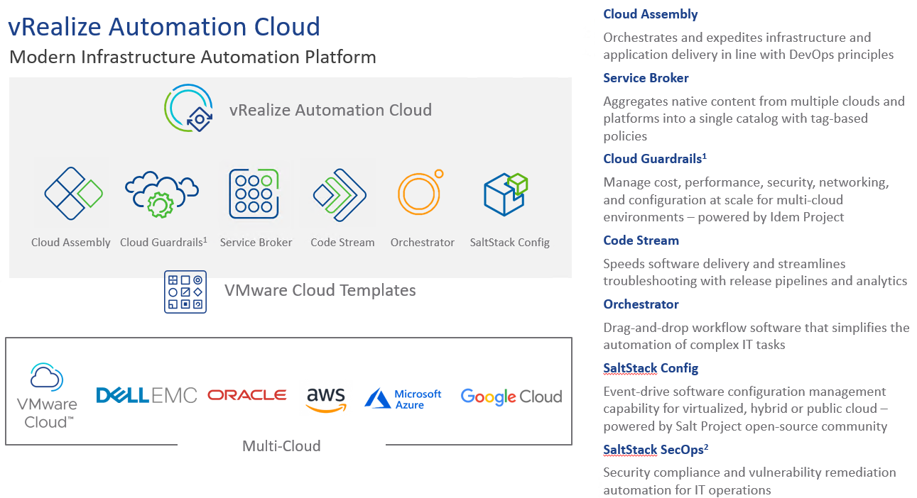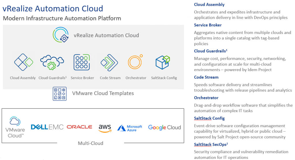 vRealize Automation is a Multi-Cloud modern infrastructure automation platform with event-driven state management, designed to help organizations control and secure self-service for Private Cloud, Hybrid Cloud and Public Cloud automation with governance with a DevOps based infrastructure delivery approach.
